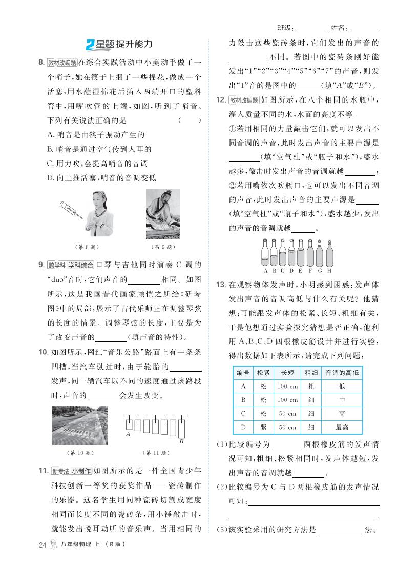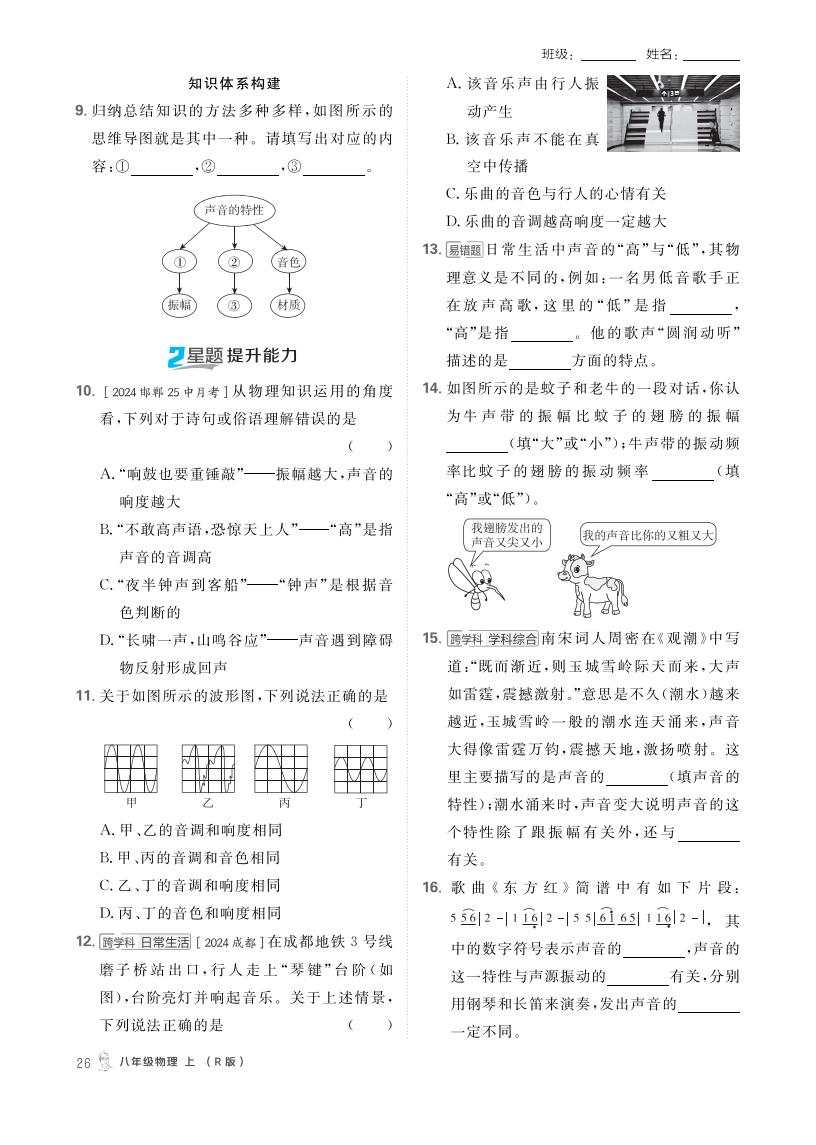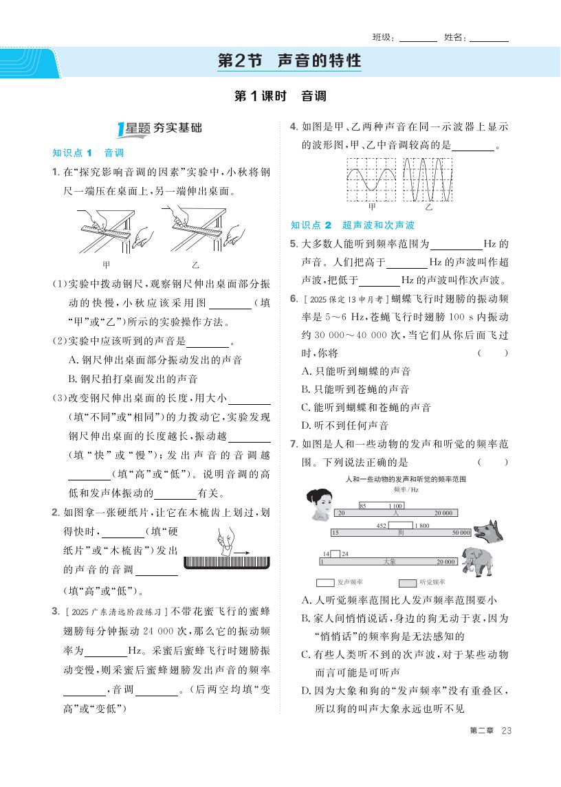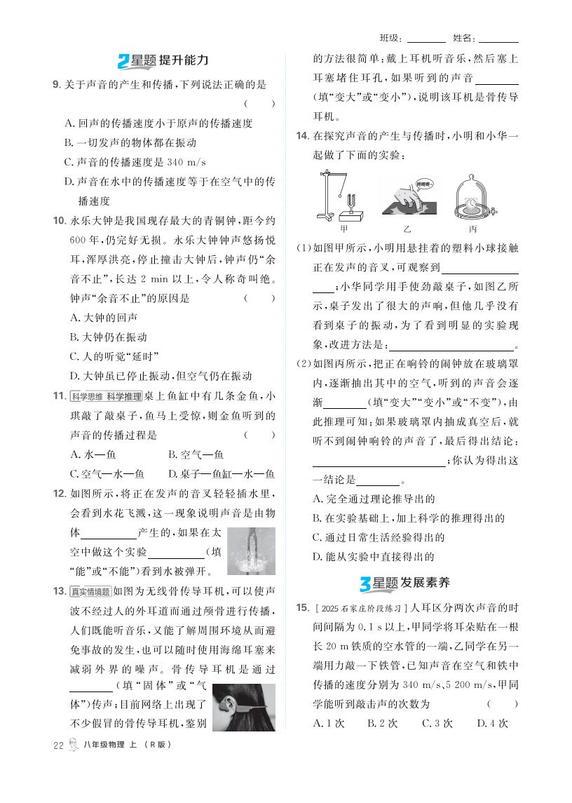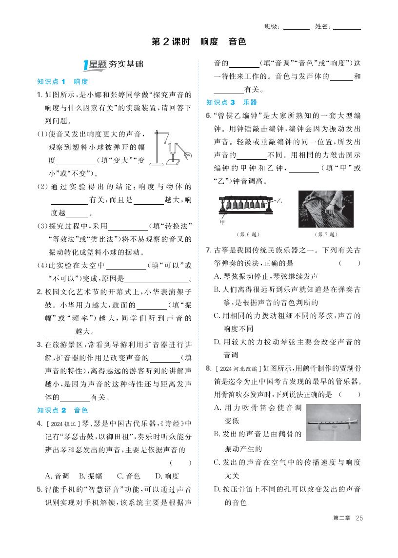 八年级物理上册RJ · 第二章声现象同步练习册-2025秋