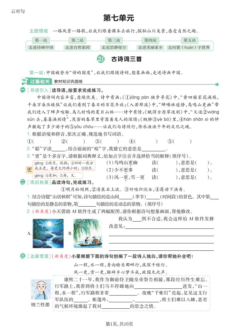 四年级语文上册 · 第三单元同步练习册-2025秋