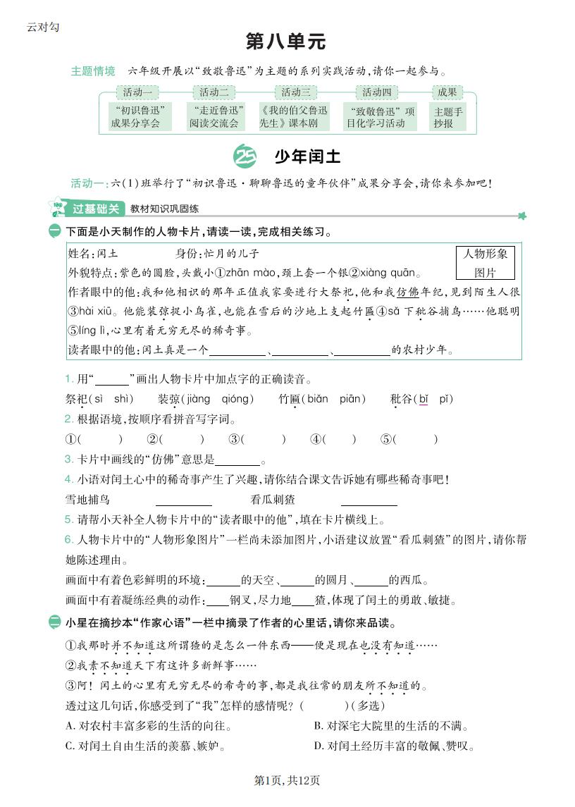六年级语文上册 · 第一单元同步练习册-2025秋